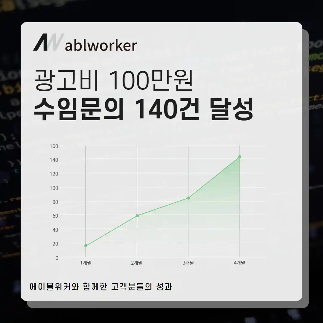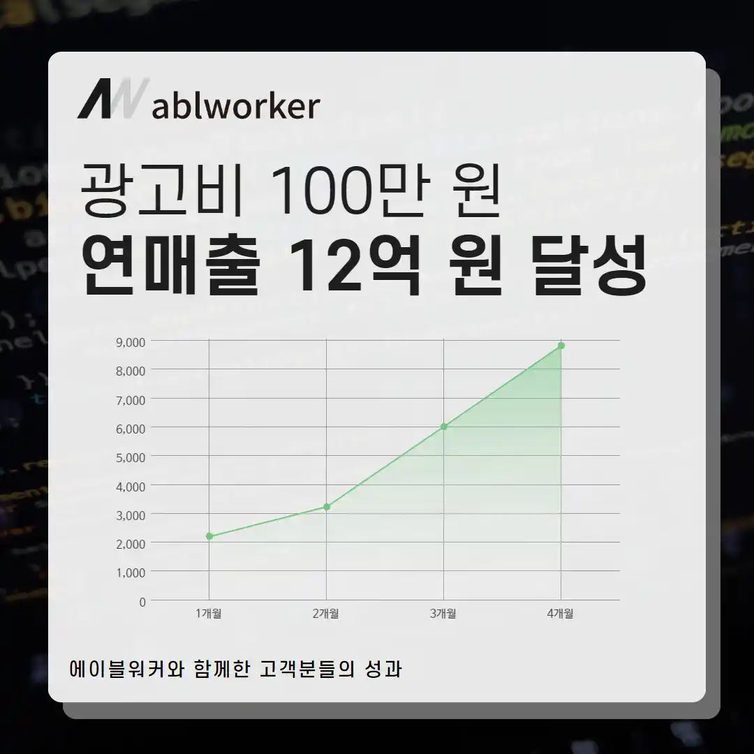 에이블워커 2025년 01월 21일 Tags 성공사례 광고비 100만원 → 연매출 12억원 만든 성공사례 광고비 100만원으로, 연매출 12억원 만든 마케팅 비밀! *마케팅 전략은 영업비밀로,