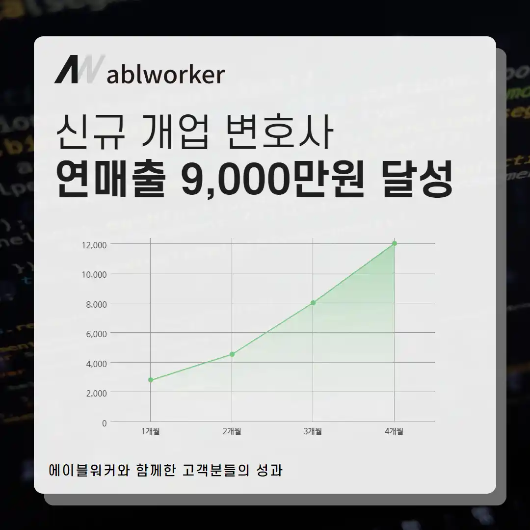 에이블워커 2025년 01월 21일 Tags 성공사례 신규 개업 변호사 → 연매출 9,000만원 달성시킨 사례 신규 개업 변호사 → 연매출 9,000만원 달성한 방법! *마케팅 전략은